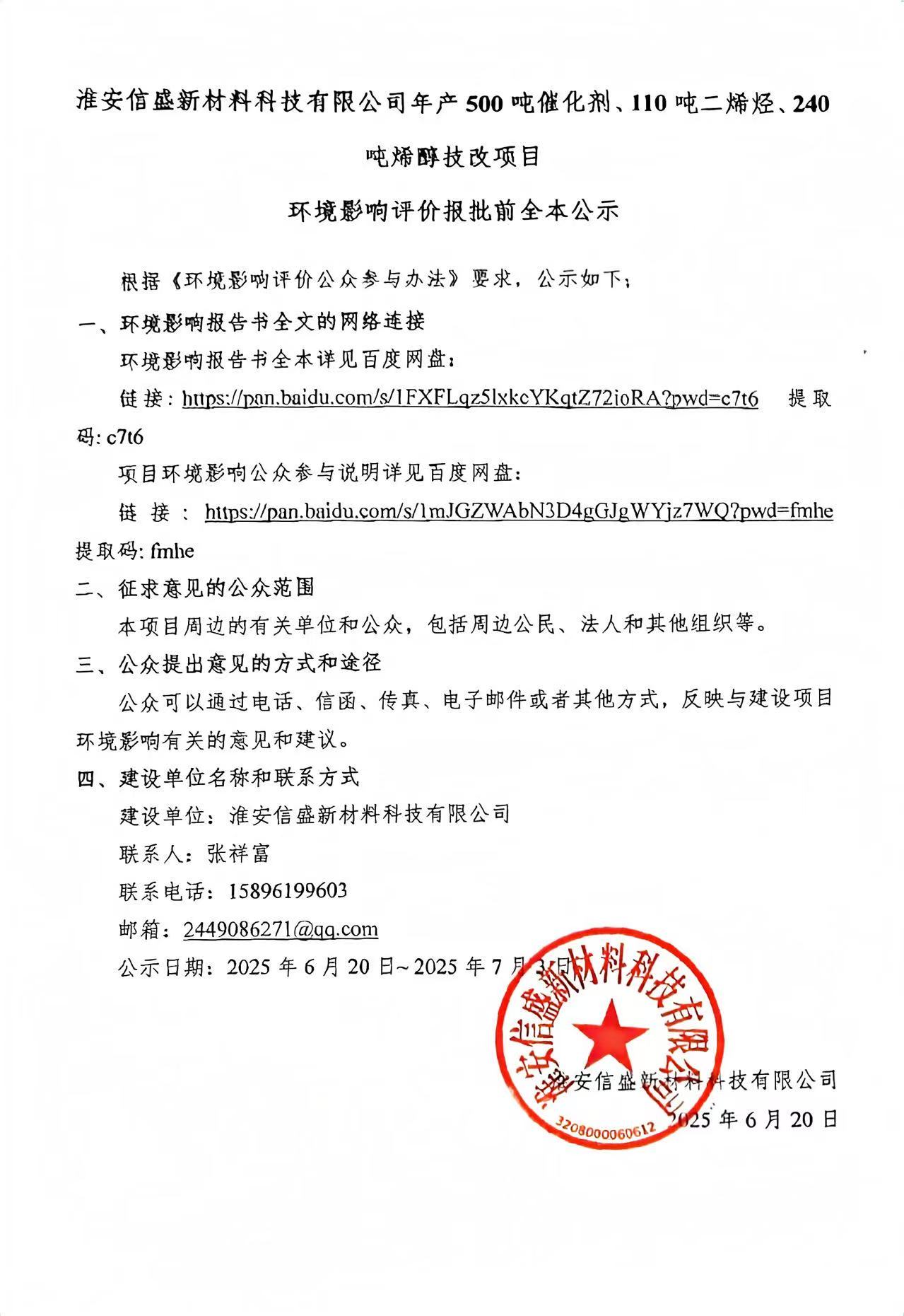 公司年产500吨催化剂、110吨二烯烃、240吨烯醇技改项目 征求意见稿公示